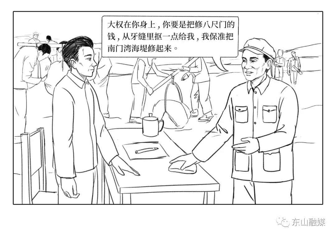 1960年的一天,谷文昌突然出現(xiàn)在八尺門工地總指揮樊生林面前,樊好奇。谷文昌把一包餅干放到他桌上,笑道:“看看老搭檔?!狈残α耍骸皠e人不知道,我還不知道老谷你有多忙?”谷文昌坐定后說:“想在城關(guān)南門灣修海堤,可是縣里沒錢。”樊一聽攤開雙手:“你是八尺門修堤組長,還能不知道?”谷文昌說:“大權(quán)在你身上,你要是把修八尺門的錢,從牙縫里摳一點給我,我保準把南門灣海堤修起來?!狈终f:“國家撥款只200萬,這點錢本來就不夠,哪還有錢支持你!”谷文昌湊近他耳朵嘀咕了老半天。