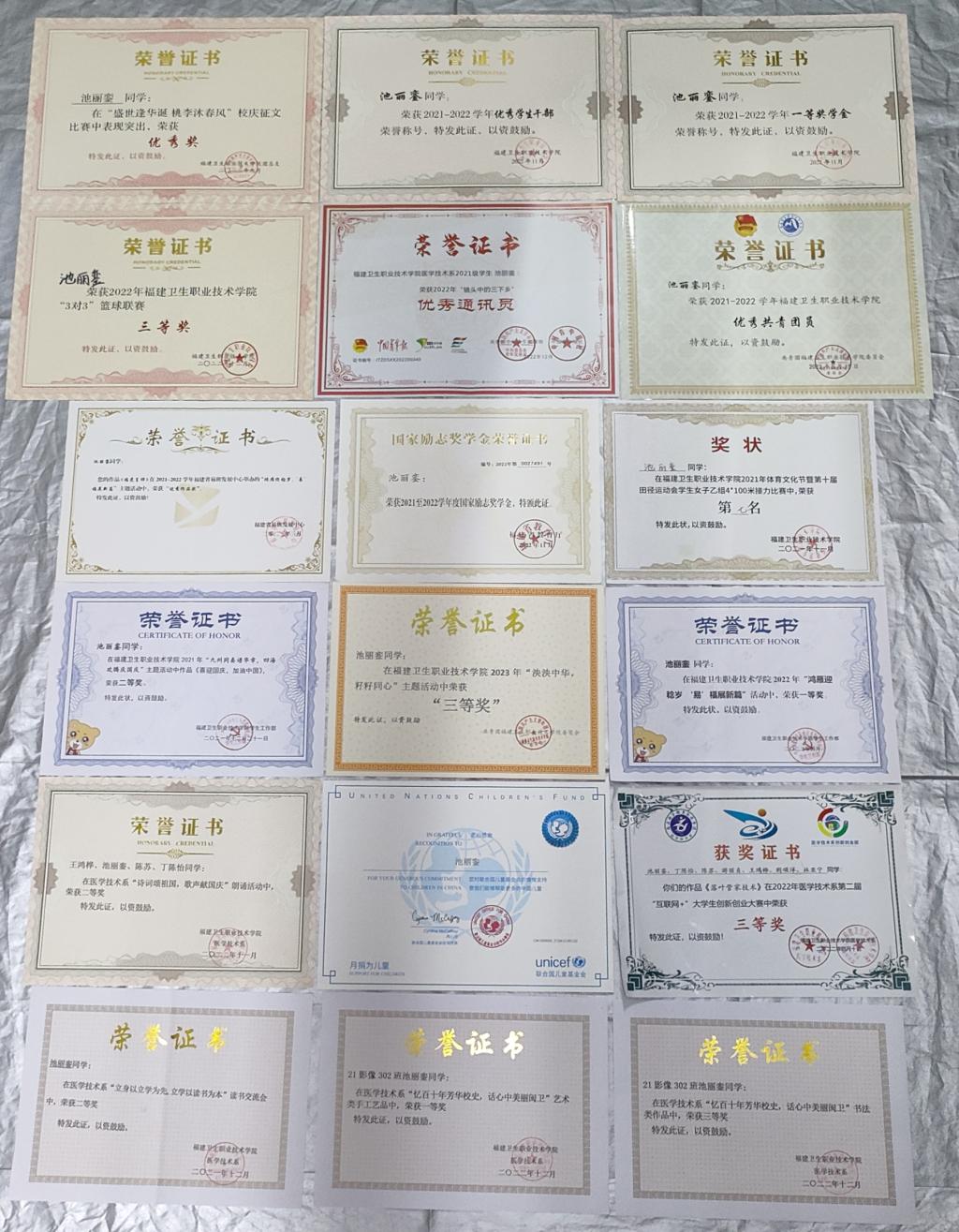 課業之余,池麗鑾還積極參與到豐富多彩的校園生活中。她在校園生活里默默的耕耘,也獲得了許多的收獲:福建省高職高專院校“青春向黨 強國有我”黨史知識競賽二等獎、艾滋病防控宣傳教育系列活動之創意防艾宣傳片大賽一等獎、“憶百十年芳華校史,話心中美麗閩衛”藝術類手工藝品一等獎、第八屆“互聯網+”大學生創新創業大賽校二等獎、第十六屆“挑戰杯”福建省大學生課外學術科技作品競賽校賽一等獎…… 一張張的獎狀看起來如此耀眼,但是獎狀的背后是一次次失敗的經驗疊加與累積,池麗鑾說:“青春允許犯錯誤,只要學會提高自我,就能在失敗中走向一個又一個成功。”