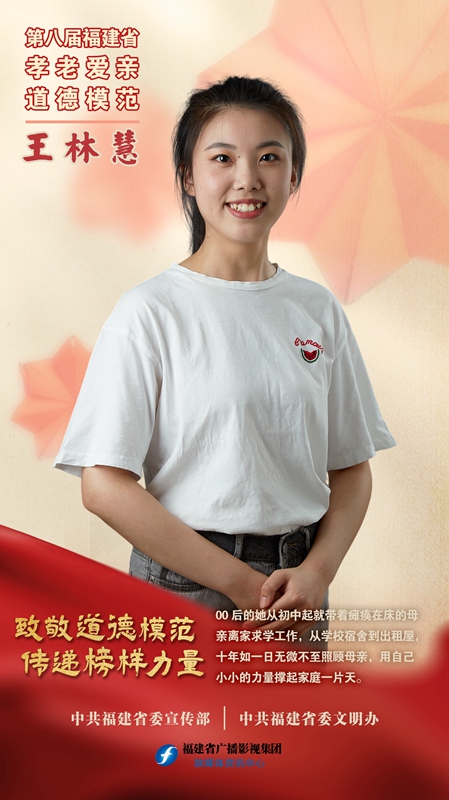 王林慧,女,2002年12月出生,我校22屆護理專業校友,預備黨員。當同齡孩子還在父母懷里撒嬌時,她已需要面對母親長年癱瘓在床、父親身體欠佳長期住院的困境,早早扛起家庭重擔。從初中起,她就帶母離家求學。十年來,從學校宿舍、醫院到出租屋,她始終如一、無怨無悔照顧母親,事事親為,用實際行動詮釋著女兒的愛與擔當。曾獲得2022年第四季度“中國好人”、2022年第三季度“福建好人”、第六屆寧德市道德模范、2020年度“中國大學生自強之星”、2020至2021學年國家勵志獎學金、第三屆寧德市“尊老孝親”美德少年、寧德市“向上向善好青年”、寧德市第三屆留守流動兒童“自強之星”等。