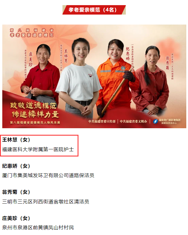 近日,福建省精神文明建設指導委員會印發《關于表彰第八屆福建省道德模范的決定》,我校22屆護理專業校友王林慧獲“孝老愛親模范”榮譽稱號。