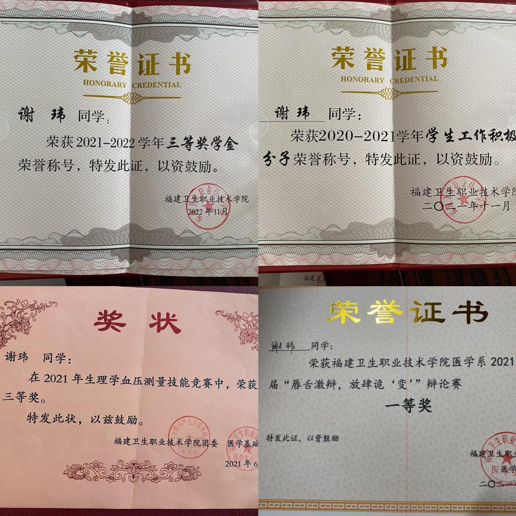 ?成為一名醫生,是謝瑋從小的夢想。帶著這份初心,她考入福建衛生職業技術學院臨床醫學專業,開啟了醫學追夢之路。在校期間,她始終牢記入學第一天所學的“技在高,更在德;術在巧,更在仁??吹氖遣。鹊氖切模婚_的是藥,給的是情?!钡尼t者信條,用赤誠的學醫之心和奉獻精神在校園中不斷積累,刻苦學習專業知識,積極參與校園活動,擔任班級學習委員,服務同學,提升自我。她不僅在學業上表現優異,還獲得了辯論賽一等獎、“學生工作積極分子”等榮譽,展現了全面發展的青春風采。