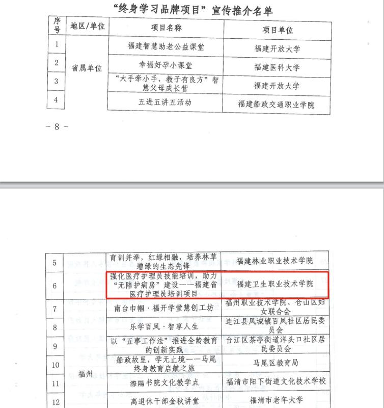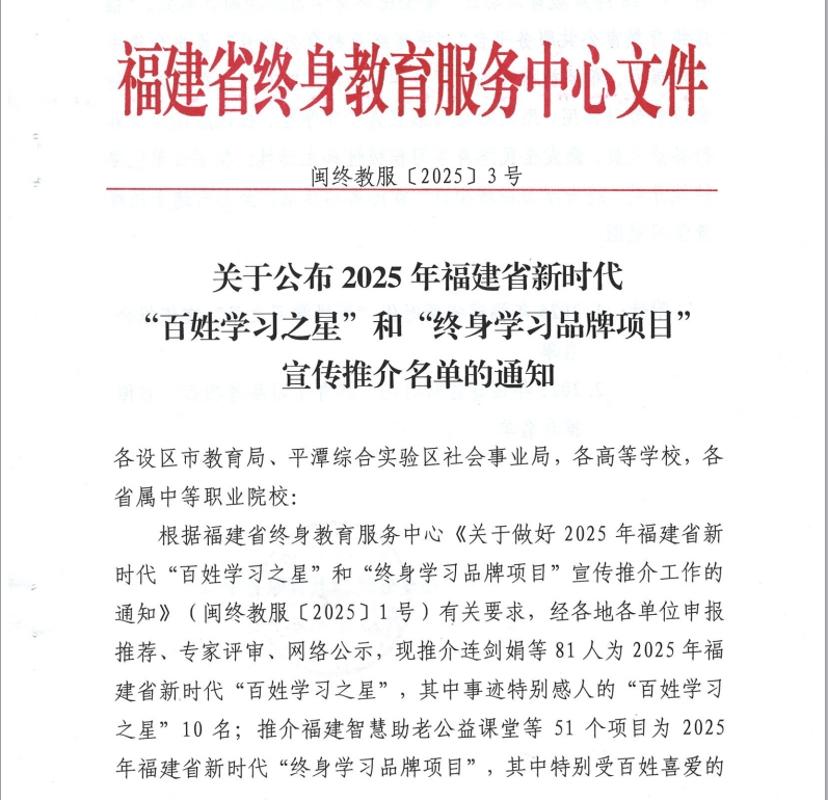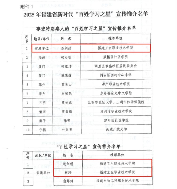 近日,福建省終身教育促進委員會公布2025年“百姓學習之星”和“終身學習品牌項目”推介名單。我校護理學院連劍娟老師、藥學院林玲老師入選“百姓學習之星”,其中連劍娟老師更是躋身全省10位事跡特別感人的“百姓學習之星”行列。繼續教育學院和護理學院聯合申報的《強化醫療護理員技能培訓,助力“無陪護病房”建設——福建省醫療護理員培訓項目》入選“終身學習品牌項目”。