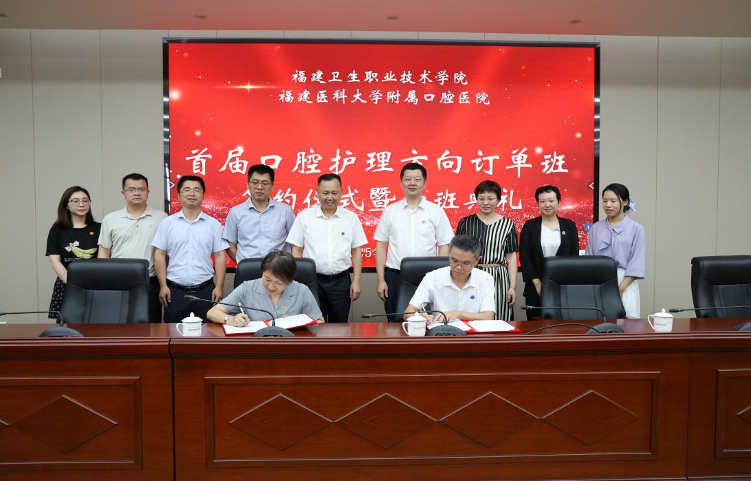 6月17日,我校與福建醫科大學附屬口腔醫院口腔護理方向訂單班簽約儀式暨開班典禮在厚德樓六樓會議室舉行。福建醫科大學附屬口腔醫院黨委副書記張尉(主持工作)、副院長駱凱、護理部負責人危艷萍、護士長謝暢暢,學校黨委書記曾武祈、副校長朱扶蓉,教務處、護理學院、醫學院相關人員以及21名口腔護理方向訂單班學生共同參加開班儀式。