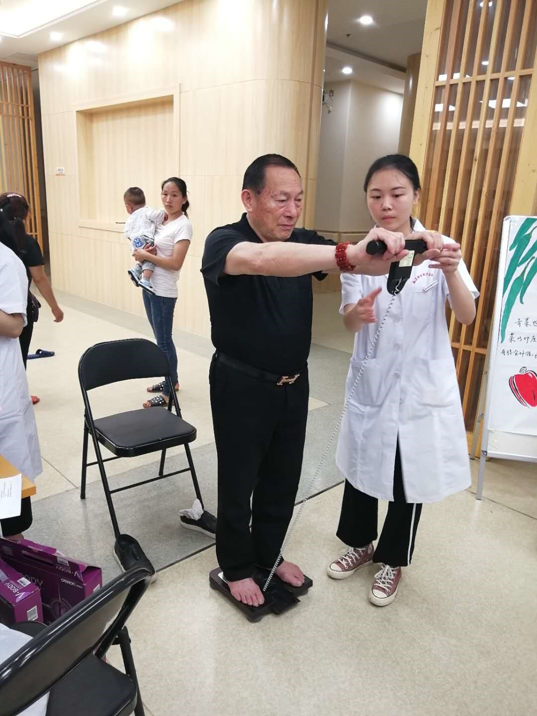 在隨后開展的義診活動中,學生們熱情地為老人們測量血壓、BMI、體脂率、內臟脂肪指數等數據,并詢問調查日常生活健康信息,為其評估健康風險;特邀的幾位專家,根據評估情況,為老人們提供醫療服務。
