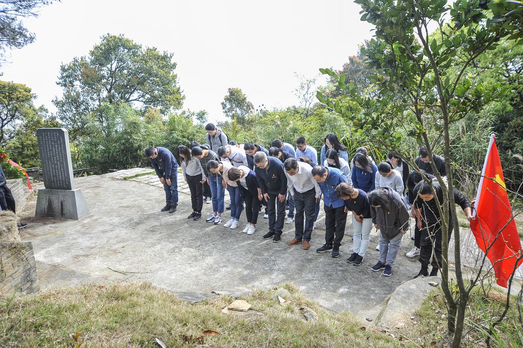伴隨著旭日的光輝,藥學院第二黨支部與福建省醫藥有限責任公司黨總支的黨員們抵達降虎寨。踏過青苔斑駁的層層石階,長眠著600多名紅軍英魂的烈士墓靜駐于松林之中。