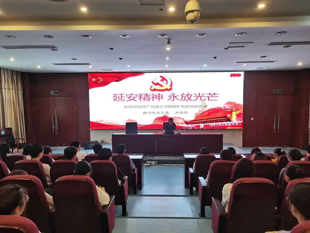 為慶祝中國共產黨成立100周年,2021年5月20日,醫學系黨總支邀請系關工委常務副主任洪聿榮為預備黨員、入黨積極分子等青年學子們講授《延安精神永放光芒》專題黨課。