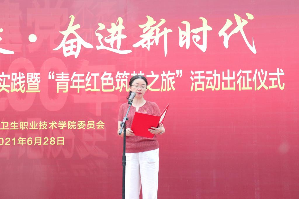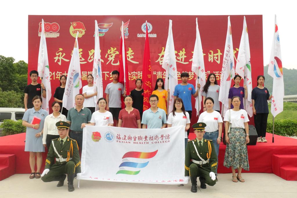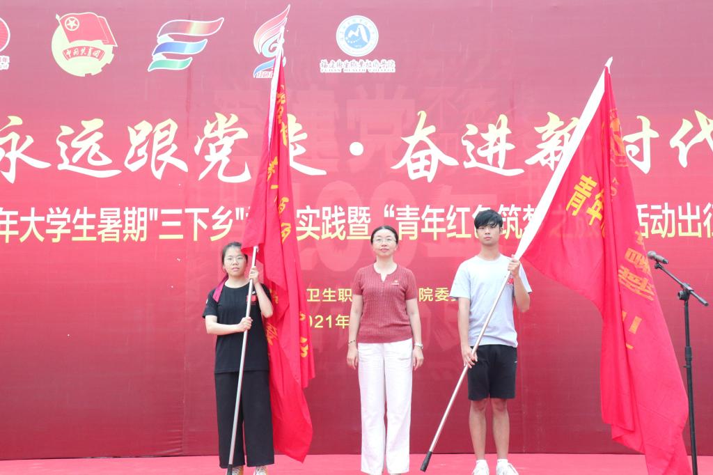 馬克思主義學院、團委負責人和藥學院、醫學技術系、健康管理系黨總支書記、副書記為8支暑期“三下鄉”社會實踐團隊授旗。