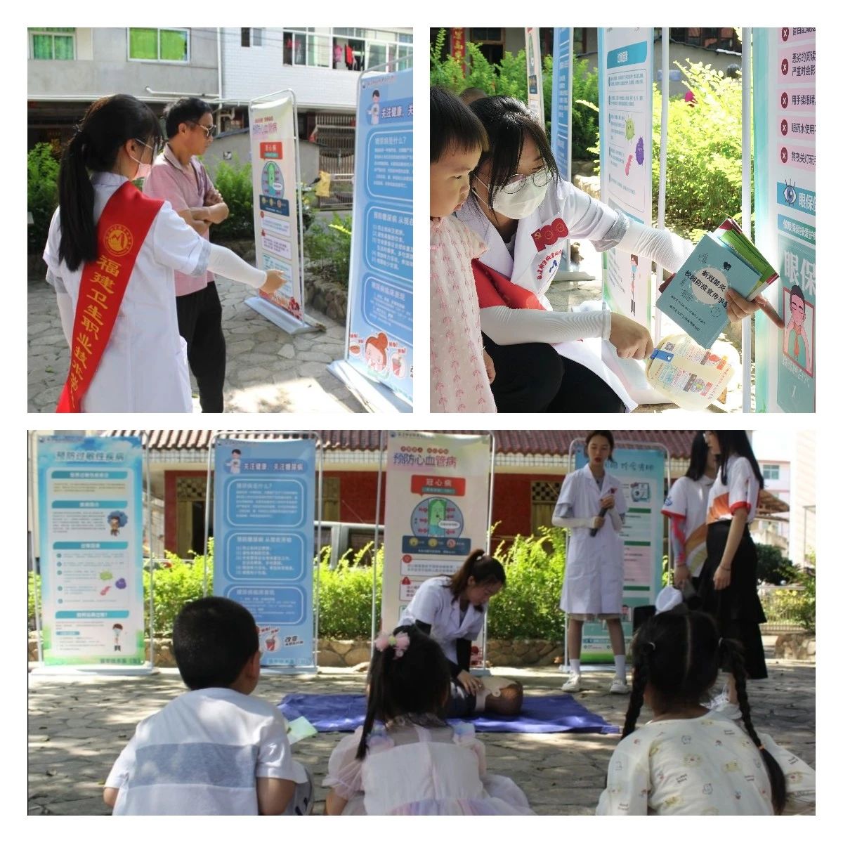 健康宣講:結合宣傳海報和圖冊,實踐隊向群眾講解科學護眼、科學控糖、心血管疾病預防及新冠肺炎疫情防控等。借助人體模型,實踐隊現場演示和教導心肺復蘇術。