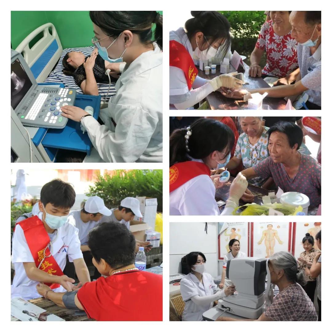 義診:實踐隊攜帶專門醫用設備,結合專業技能特長,為群眾提供量血壓、查血糖、測膽固醇、眼部檢查、B超檢查等服務,并發放消毒、防暑、常見藥等醫療物資。