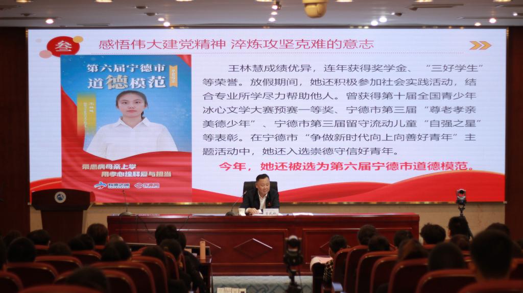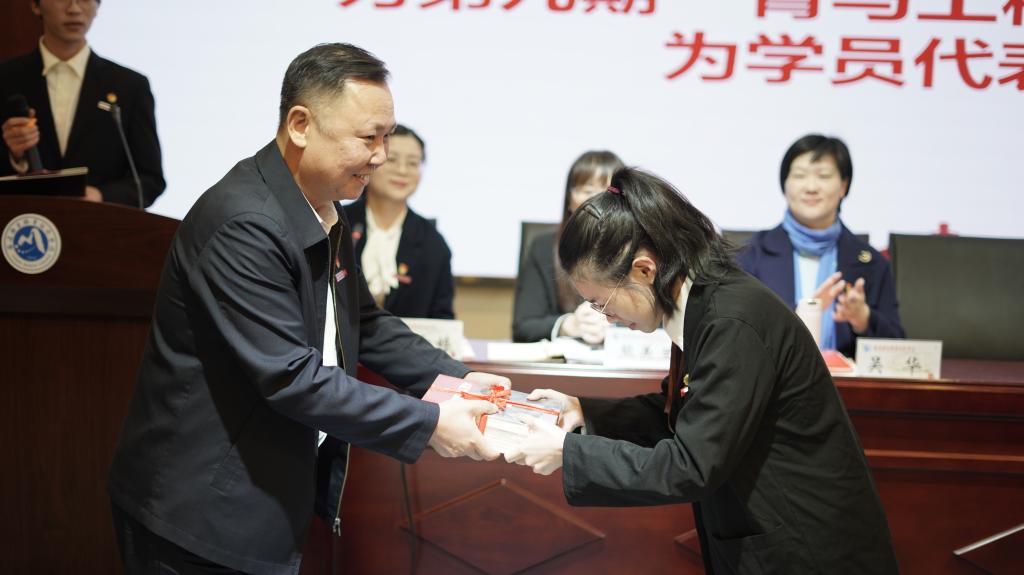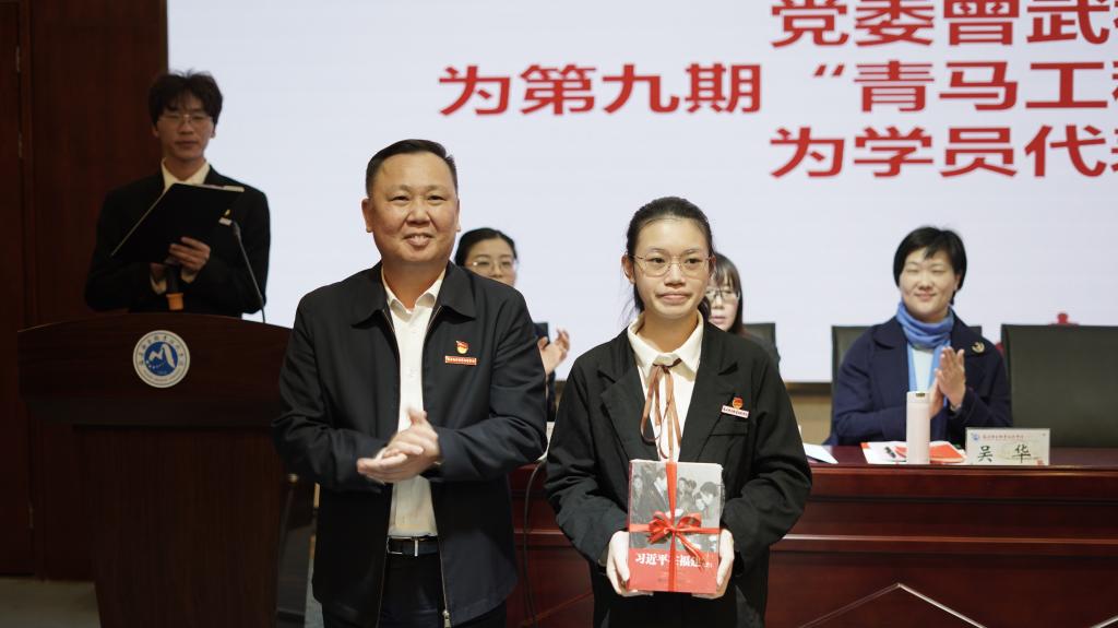 曾武祈為第九期“青馬工程”培訓班授旗并贈予學生代表《習近平在福建》系列書籍,勉勵青馬學員從習近平總書記在閩工作的點點滴滴中磨礪自我,篤定共產主義信仰。