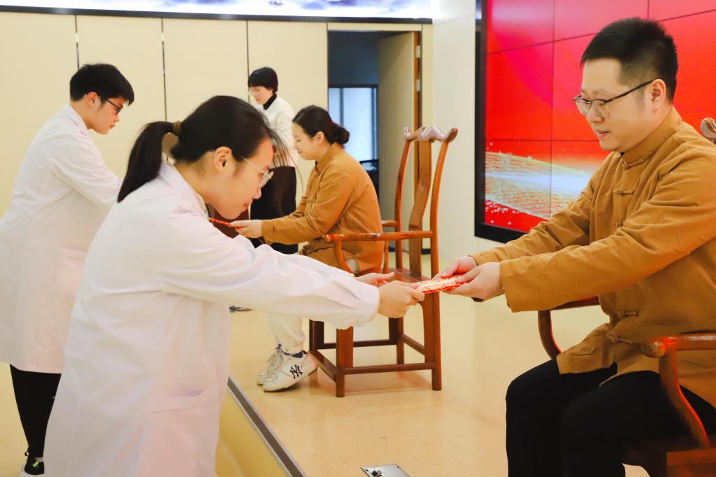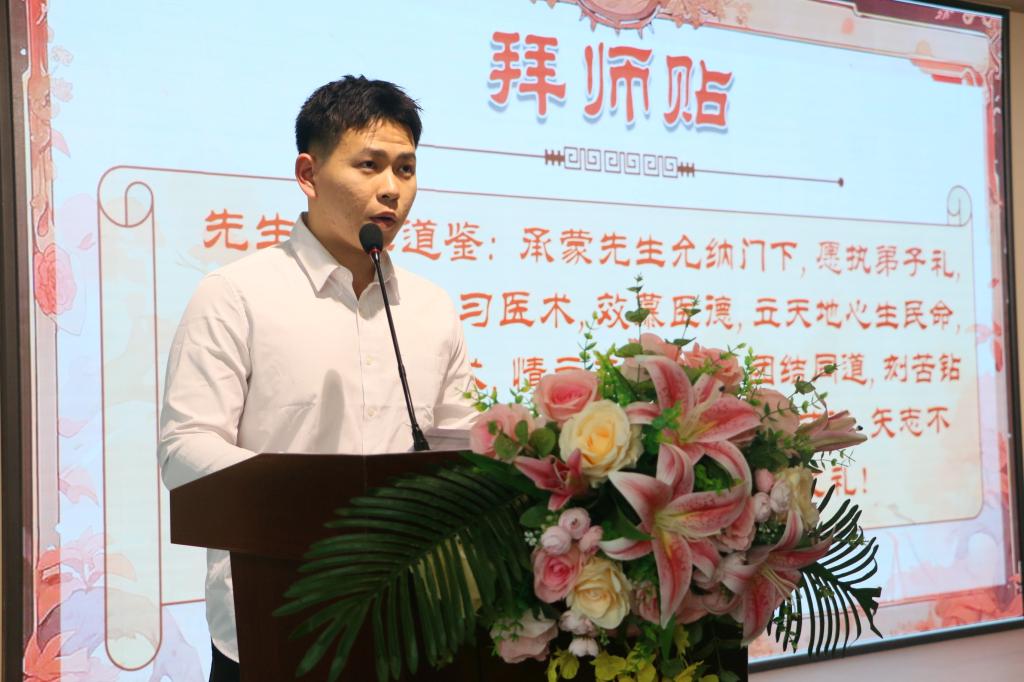 師承教育是中醫藥人才培養的主要模式,在傳承中醫藥學術思想、臨床經驗方面發揮著不可替代的重要作用,而拜師是對中華醫學的繼承。學生們依次向自己的導師鞠躬行禮、呈拜師帖、奉茶、獻花。