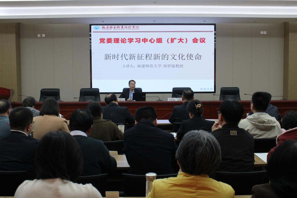 1月18日下午,校黨委理論學習中心組召開學習(擴大)會議,福建師范大學鄭碧強教授應邀到會,作題為“新時代新征程新的文化使命”的專題輔導報告。校領導、全體中層干部參加會議,校黨委書記曾武祈主持會議。