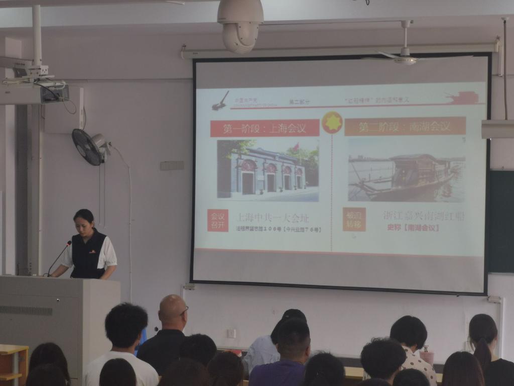系黨總支副書記陳潔為全體黨員和入黨積極分子作黨史學習教育專題宣講,用“紅船精神”教育黨員和青年學生,要立足本職,盡心盡職,勇于擔當,走好新的“長征路”。