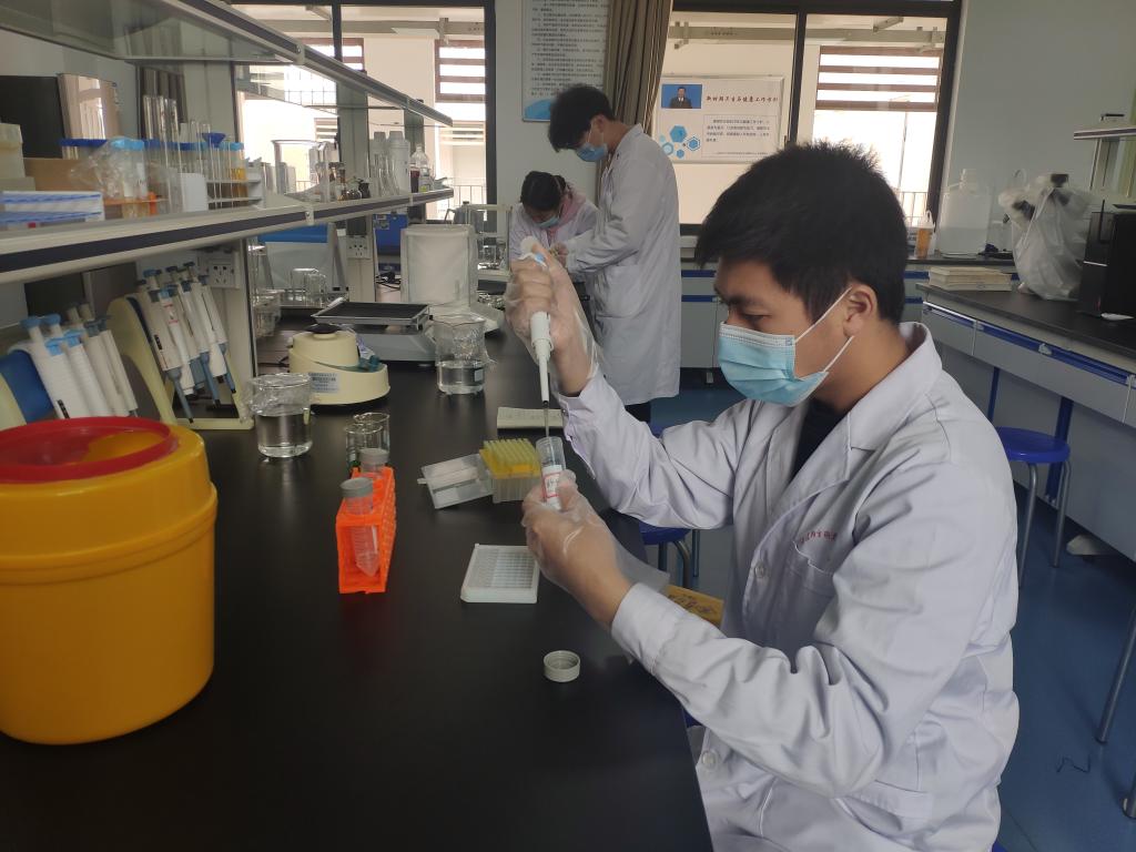 食品質(zhì)量檢測小組對三個食堂的餐飲衛(wèi)生進行督查,并隨機抽取食堂當日采購且切洗浸泡后的蔬菜包括萵筍葉、葫蘆、冬瓜、上海青、空心菜、大白菜、花菜、土豆、西紅柿、青椒等,隨機抽取10余份食堂正在使用及還未使用的食用油,采用酶抑制率法檢測蔬菜中的農(nóng)藥殘留,同時用快速檢測法檢測食用油酸價和過氧化值。檢測工作在健康管理系安全性評價實訓室開展,由專業(yè)教師揭金花、李丹及預防醫(yī)學專業(yè)學生入黨積極分子共同完成。
