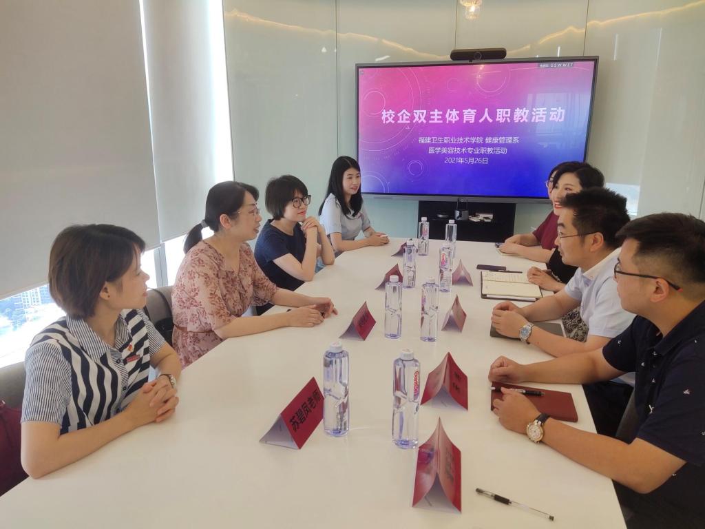2021年5月26日下午,健康管理系黨總支第一支部書記、醫(yī)學(xué)美容技術(shù)專業(yè)帶頭人吳明,醫(yī)學(xué)美容與中醫(yī)養(yǎng)生教研室主任楊笑等一行4人到訪福州華窈美容企業(yè),華窈美容企業(yè)黨支部書記宋煒、華窈美容企業(yè)人力總監(jiān)夏奕林共同參與校企支部共建活動。