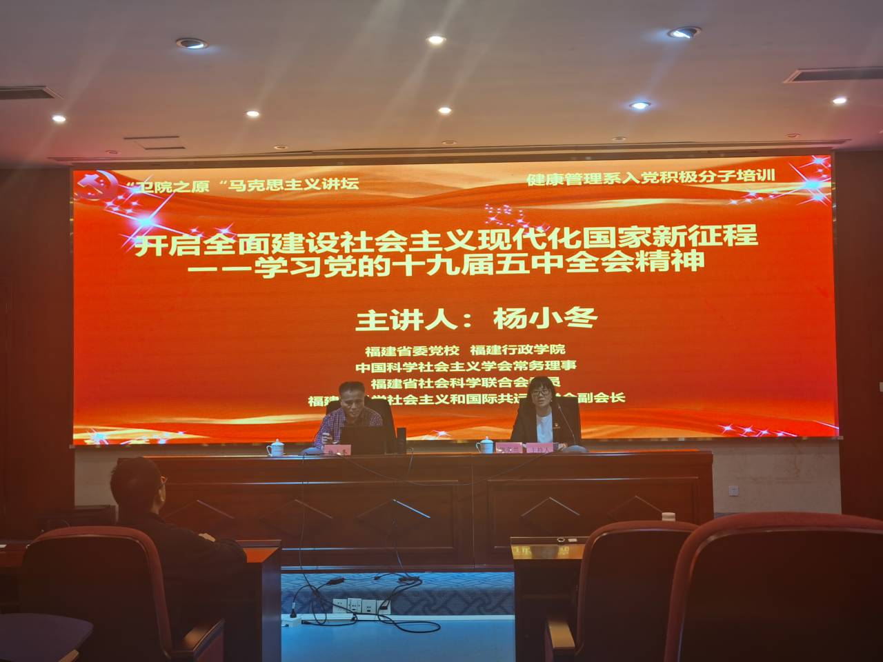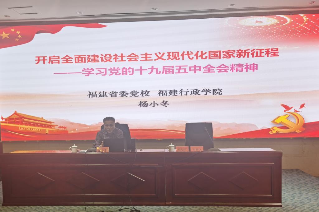 為深入學習領會習近平新時代中國特色社會主義思想和黨的十九屆五中全會精神,深刻認識我國當前社會發展新階段新特征,增強“四個意識”、堅定“四個自信”、做到“兩個維護”,2021年3月19日,福建省委黨校、福建行政學院楊小冬教授應邀為我校馬克思主義講壇開設《開啟全面建設社會主義現代化國家新征程——學習黨的十九屆五中全會精神》的專題講座。講座由馬克思主義學院院長熊美蘭主持,馬院全體思政課教師和健康管理系入黨積極分子參加了講座。