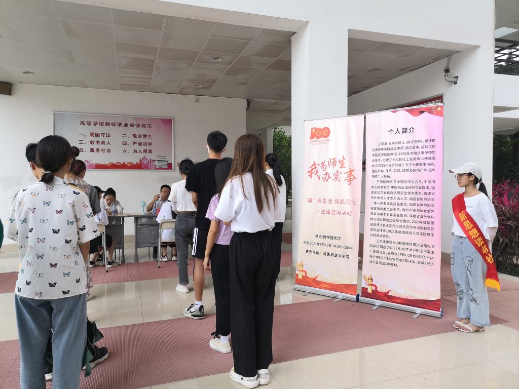 本次活動特別邀請了福建工程學院法學院副教授王崇能,現場提供法律咨詢服務,為我校師生答疑解惑。王崇能副教授,福建建達律師事務所高級律師,自1996年從事律師職業至今,辦理了700起以上各類訴訟仲裁案件,擅長海事海商、國際貿易、保險等領域的民事爭議案件。