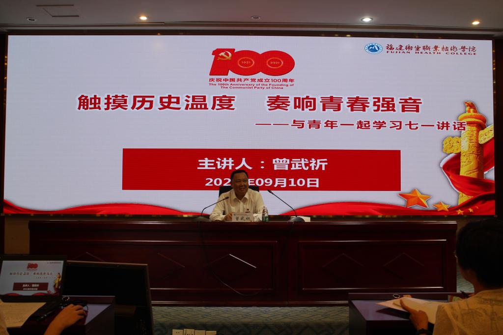 為深入學習貫徹習近平總書記在慶祝中國共產黨成立100周年大會上的重要講話精神,2021年9月10日,直屬馬克思主義學院全體教師黨員在實訓樓4樓報告廳參加校黨委書記曾武祈的題為“觸摸歷史溫度,奏響青春強音”的黨課學習。