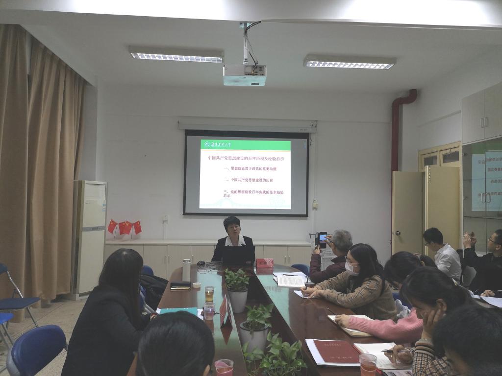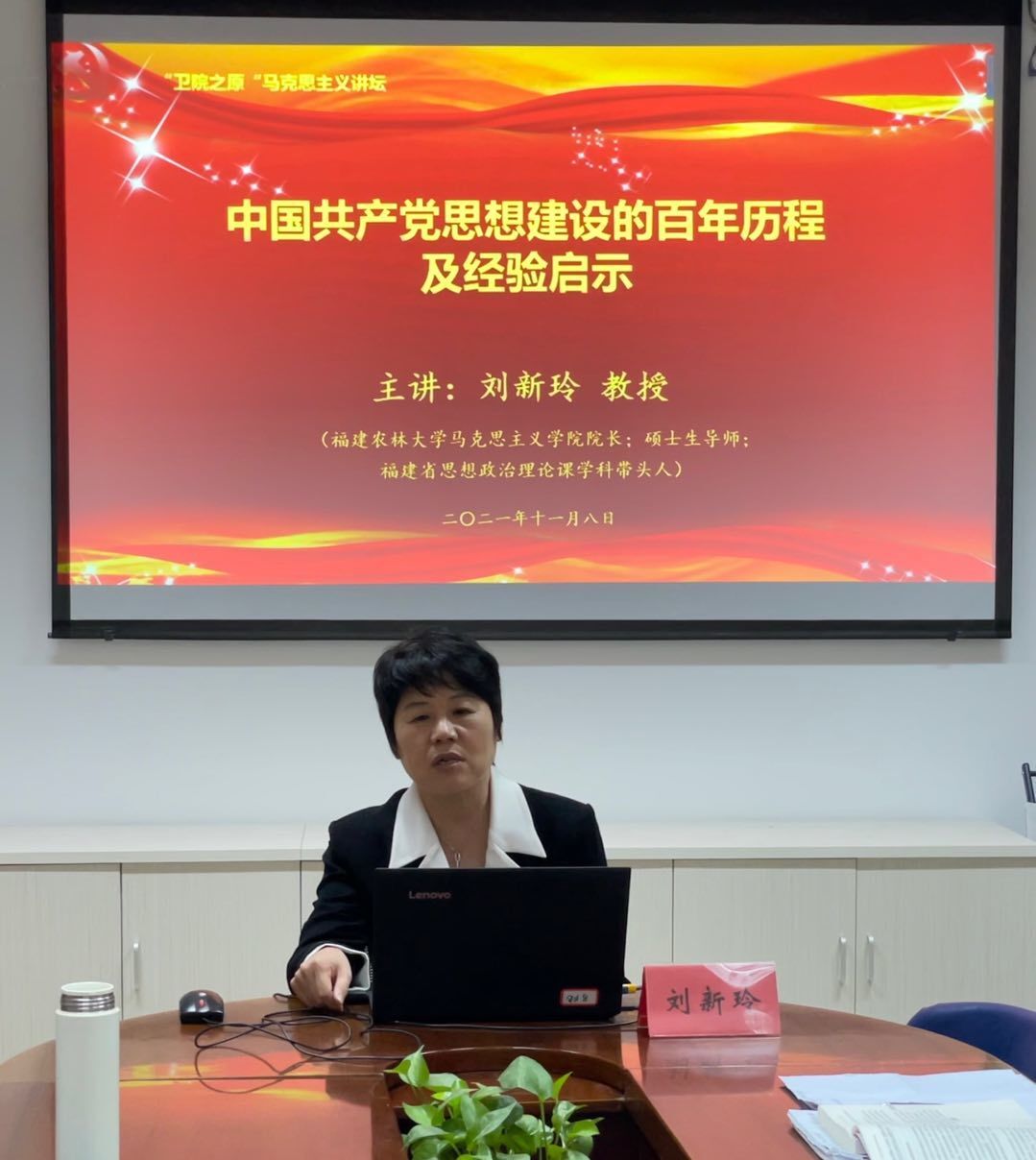 為貫徹落實“七一”重要講話精神,深入學(xué)習(xí)百年黨史,從黨的百年奮斗歷程中感悟思想偉力,2021年11月8日,我校馬克思主義學(xué)院特邀福建農(nóng)林大學(xué)馬克思主義學(xué)院院長、福建省思想政治理論課學(xué)科帶頭人劉新玲教授在行政樓107會議室作題為《中國共產(chǎn)黨思想建設(shè)的百年歷程及歷史經(jīng)驗》的專題講座。講座由馬克思主義學(xué)院院長熊美蘭主持,馬克思主義學(xué)院全體專兼職教師出席。