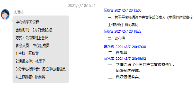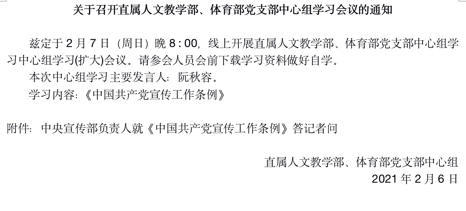 2月7日晚上,直屬人文教學部和體育部黨支部線上召開中心組學習(擴大)會議,專題組織學習《中國共產黨宣傳工作條例》(以下簡稱《條例》)和傳達全國宣傳部長會議精神,會議由直屬人文教學部和體育部黨支部書記阮秋容同志主持,人文教學部和體育部領導班子、直屬黨支部支委委員、系辦人員等參加了會議。