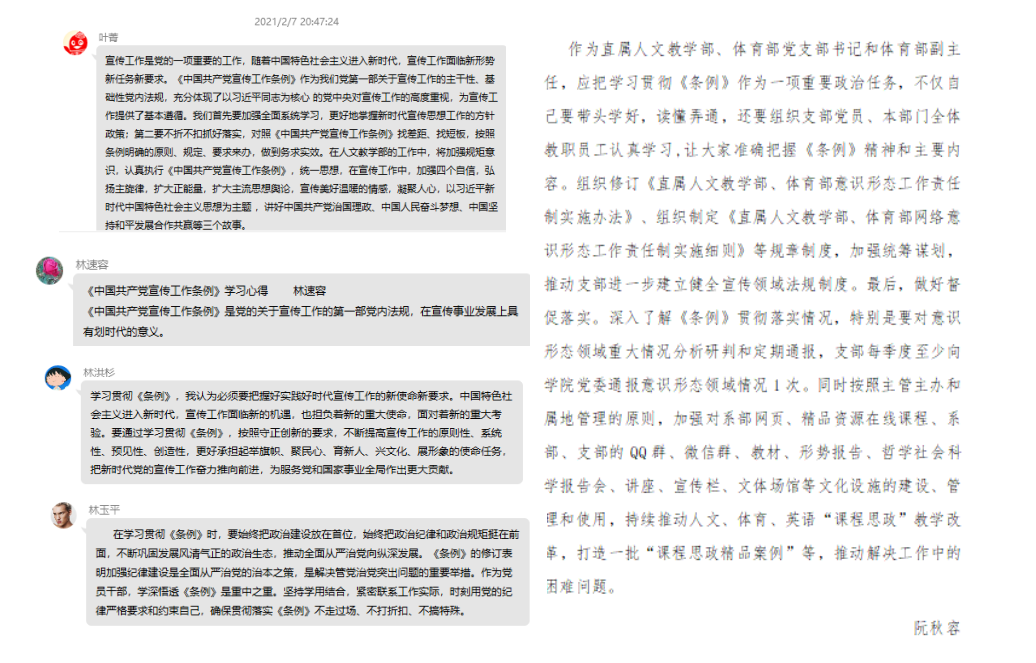 最后,阮秋容書記結合工作實際,對學習貫徹《條例》做了部署,強調中心組成員按照《宣傳工作條例》規定要求,緊扣“一個高舉”“兩個鞏固”“三個建設”的根本任務,不斷提升宣傳思想工作的質量和水平。一要學懂弄通《條例》。應把學習貫徹《條例》作為一項重要政治任務,準確把握《條例》精神和主要內容。二要加強制度保障。加強統籌謀劃,推動支部進一步建立健全宣傳領域法規制度。三要做好督促落實。按照主管主辦和屬地管理的原則,加強對系部文化設施、陣地的建設、管理和使用,推動解決工作中的困難問題。
