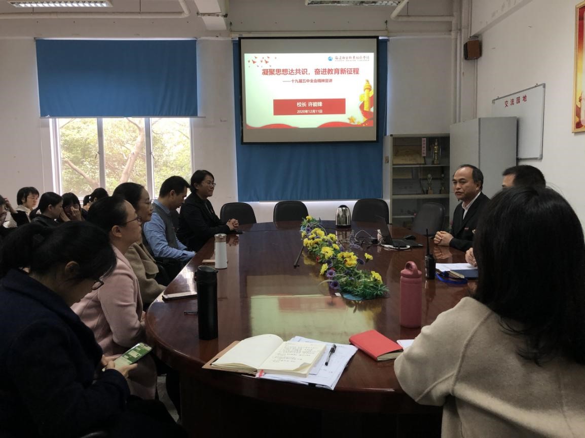 許能鋒用1234569的數字方式,解讀了黨的十九屆五中全會精神中的一個主題、兩件大事、三個新的邏輯主線、四個全面戰略升級、五個堅持基本原則、六個新目標和九個遠景目標。同時還回顧了我校“十三五”時期教育發展取得的顯著成就,并對學校“十四五”規劃的總體目標、建設思路進行了展望。