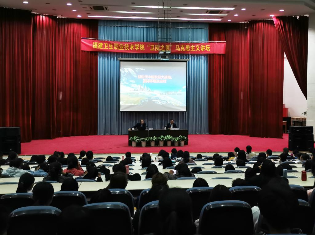 為深入開展“不忘初心、牢記使命”主題教育,增強(qiáng)我校師生的初心使命意識(shí)和勇于擔(dān)當(dāng)作為的歷史責(zé)任感、使命感和緊迫感,11月28日下午,我校“衛(wèi)院之原”馬克思主義論壇在學(xué)術(shù)報(bào)告廳舉行。本次論壇邀請(qǐng)福建江夏學(xué)院馬克思主義學(xué)院院長郭健彪教授為我校師生“新時(shí)代中國的發(fā)展大戰(zhàn)略及當(dāng)下面對(duì)的國際環(huán)境”專題講座。講座由校黨委書記曾武祈主持,校黨委副書記李美華、各系部、學(xué)工處和團(tuán)委中層干部、全體輔導(dǎo)員、馬院全體教師、護(hù)理系學(xué)生代表、管理系學(xué)生代表及社團(tuán)學(xué)生代表參加了此次活動(dòng)。