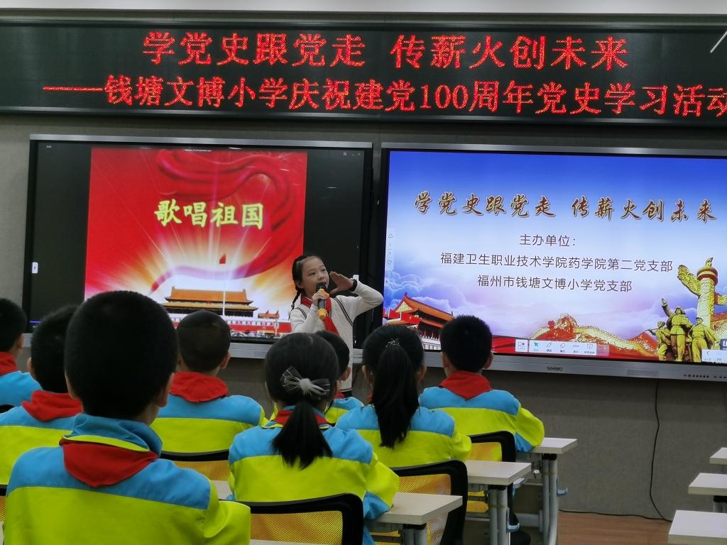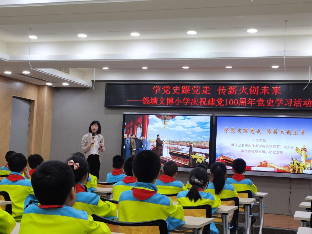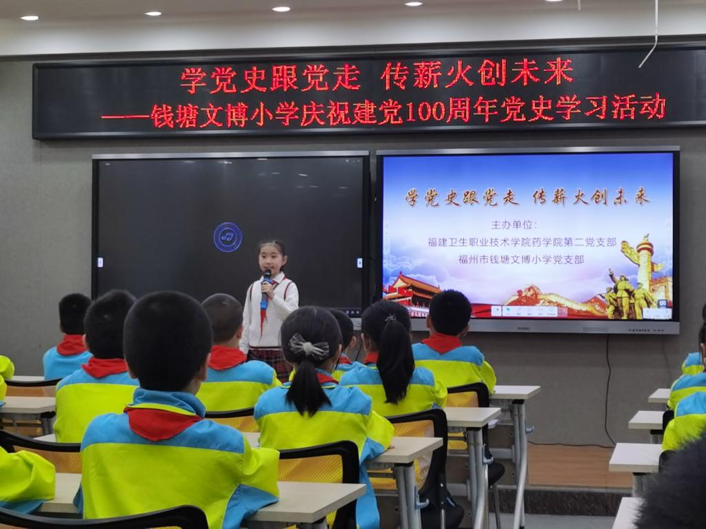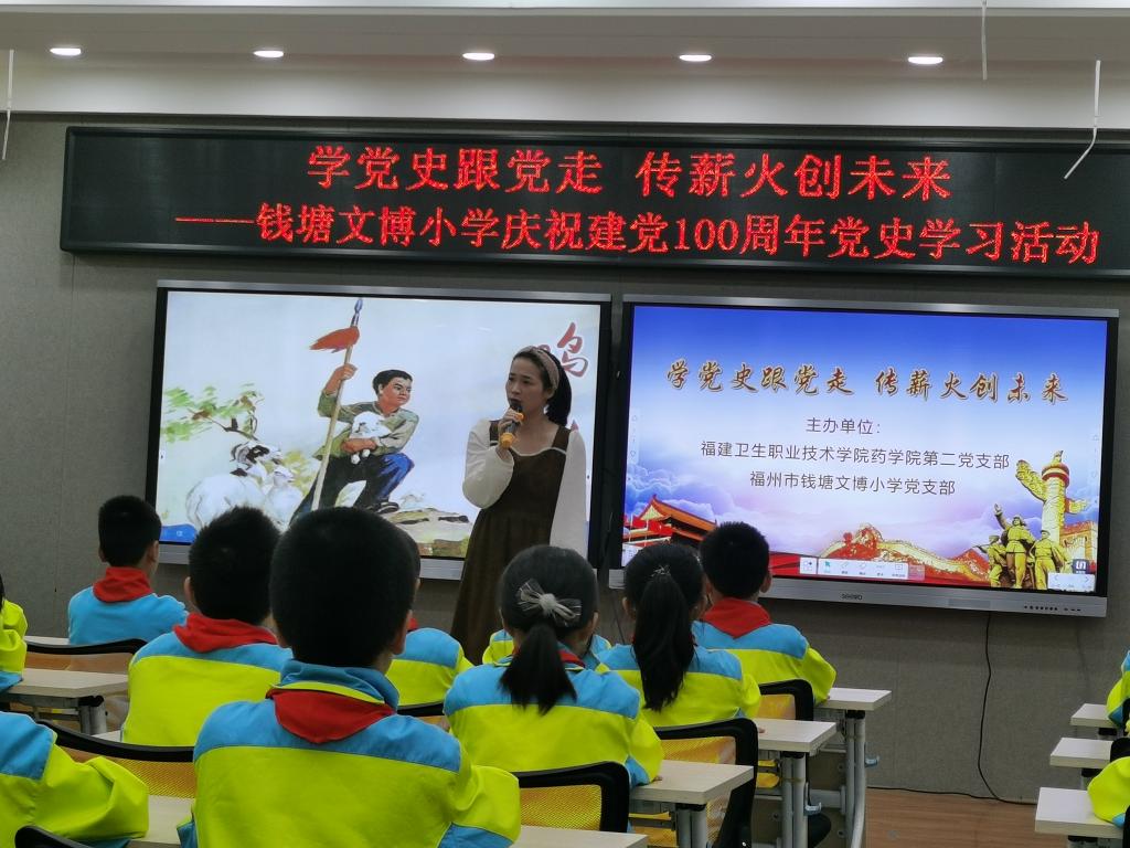 2021年4月16日下午,我校藥學院第二黨支部與福州市錢塘文博小學黨支部聯合開展了以“學黨史跟黨走,傳薪火創未來”為主題的黨史學習教育。其余未能到現場的師生,通過現場直播的方式同步線上參與活動。