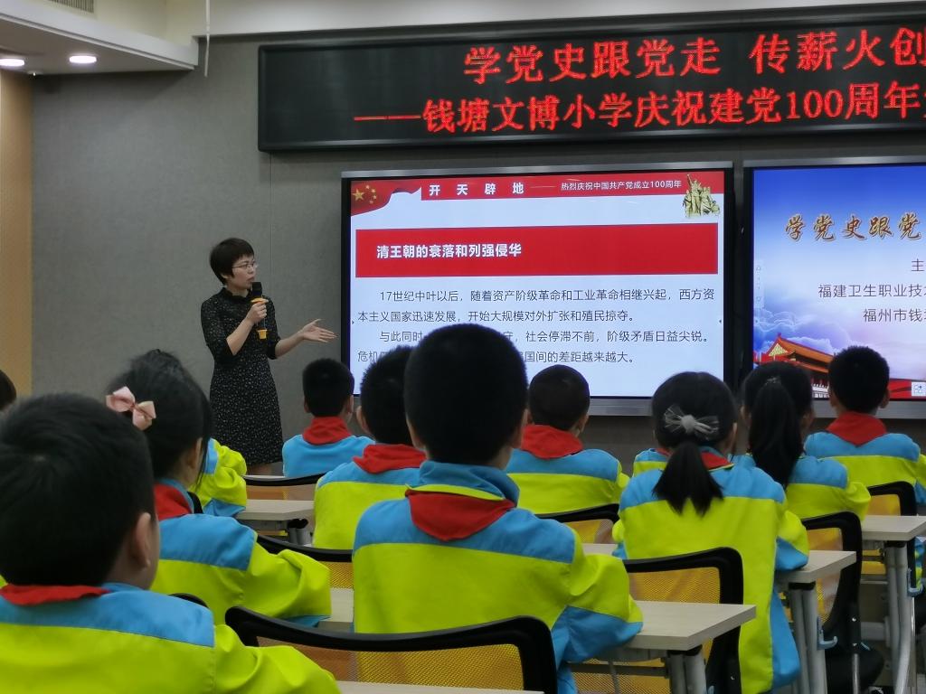 藥學院第二黨支部書記劉丹丹為錢塘文博小學的同學們介紹中國共產黨成立的歷史背景,總結了中國共產黨人領導中國人民推翻“三座大山”徹底改變中國面貌的豐功偉績,指出了中國共產黨帶領中國人民走出困境的歷史必然性。劉書記激情澎湃的演講點燃了同學們學習黨史的熱情。