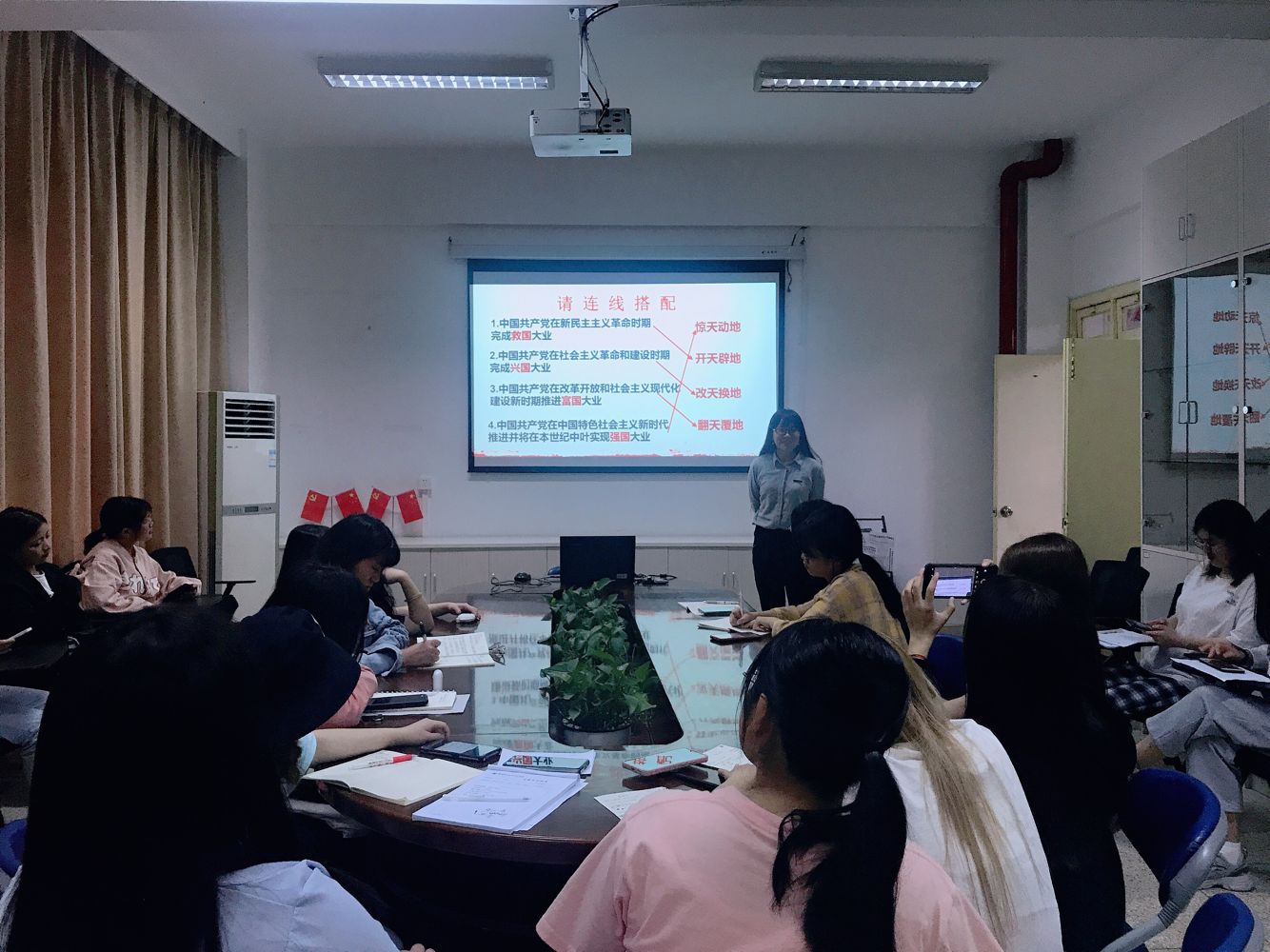 習近平新時代中國特色社會主義思想讀書社原夢隊同學于2021年4月25日齊聚馬院社團研討室,由熊美蘭老師作題為“百年光輝路奮進正青春”的專題宣講。熊美蘭老師利用理論和數據從黨史發展脈絡及學習意義、新民主主義革命時期、社會主義革命和建設時期、改革開放和社會主義現代化建設新時期、中國特色社會主義進入新時代等五個方面娓娓道來,與同學們一起回顧黨的歷史發展。