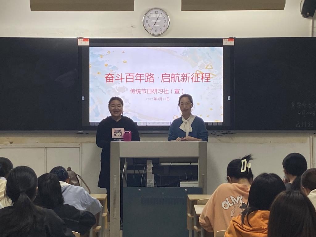 傳統節日研習社指導老師顏冰鳳、林美辰于4月20日晚上在教103召開了“百年黨史 精神永存”理論宣講會。此次理論宣講以時間軸脈絡為主線為同學們梳理和講解黨的百年歷史,從“建黨偉業:初心使命的時代呼喚”到“革命抗戰:初心使命的中流砥柱”再到“建國執政:初心使命的發展奇跡”,每個部分都以翔實的數據案例展現并娓娓道來。