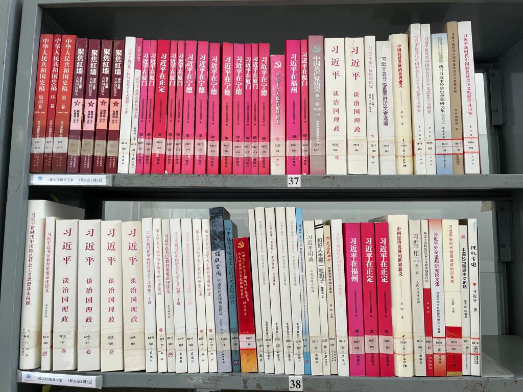 專架陳列了《習近平著作選讀》(第一卷、第二卷)、《習近平關于調查研究論述摘編》《習近平新時代中國特色社會主義思想專題摘編》《習近平新時代中國特色社會主義思想學習綱要(2023年版)》等主題教育重要學習材料,以及習近平新時代中國特色社會主義思想其他相關圖書,包括習近平總書記著作、論述摘編、學習讀本、工作足跡、思想研究、系列重要講話、語言典故等共計500余冊,可供廣大師生前往借閱。