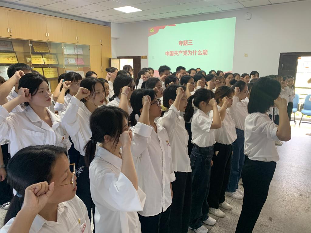 2021年7月5日,藥學院黨總支組織52名新發展實習生預備黨員在會議室開展入黨宣誓。面向鮮紅的中國共產黨黨旗,教師預備黨員張麗華帶領新黨員舉起右拳莊嚴宣誓。新黨員們的錚錚誓言,表達了作為新時代共產黨員的責任與擔當,也向黨許下了對黨忠誠、永不叛黨的堅定承諾。