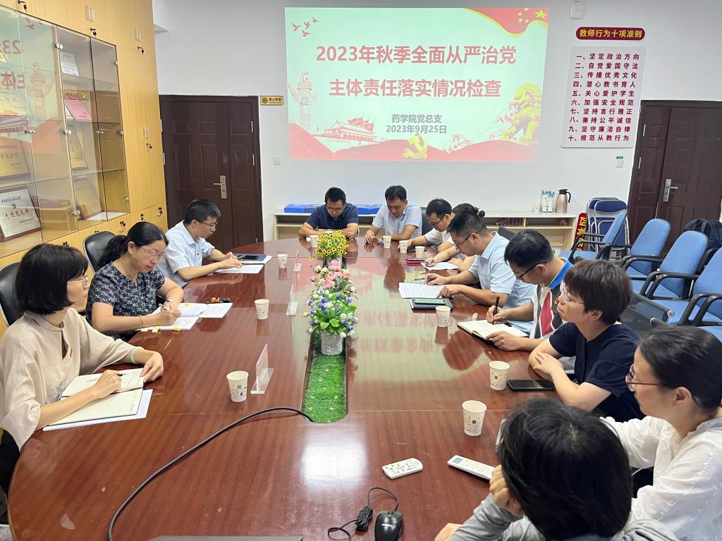 2023年9月25日,藥學(xué)院黨總支在會議室召開2023年秋季全面從嚴治黨主體責(zé)任落實情況檢查會。學(xué)校主題教育協(xié)調(diào)推進四組組長、副校長黃銘珊,組員護理學(xué)院黨總支副書記林來元、護理學(xué)院黨總支專職組織員許慧瓊到會指導(dǎo),藥學(xué)院黨政領(lǐng)導(dǎo)班子成員、總支支委、各支部書記參加本次會議。