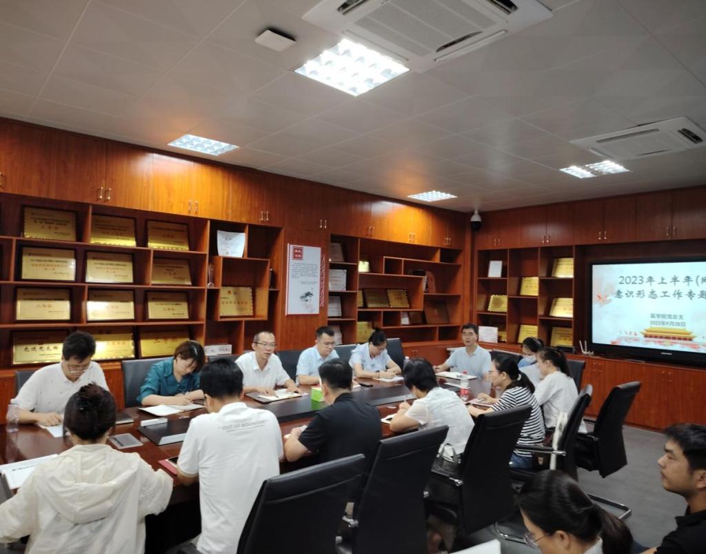 為深入貫徹落實習近平總書記關于意識形態工作的重要講話和重要指示精神,全面分析研判當前意識形態工作中存在的問題和薄弱環節,嚴格落實意識形態工作責任制,9月28日,醫學院黨總支召開2023年上半年(網絡)意識形態工作專題會,院領導班子成員、各黨支部書記、教研室主任以及團總支書記參加了會議。