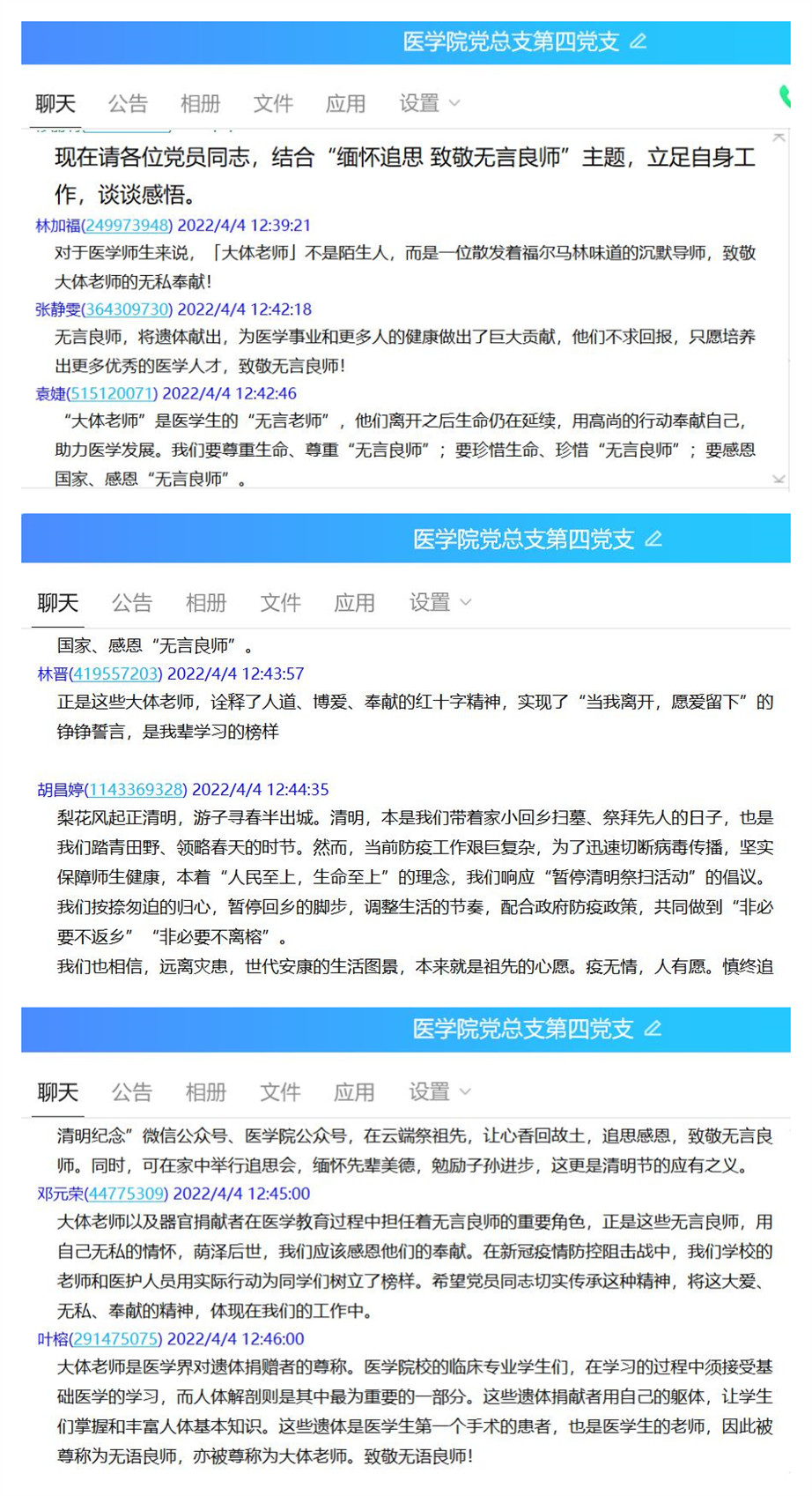 4月4日,醫學院第四黨支部舉辦“線上緬懷追思 致敬無言良師”主題黨日活動。抗擊疫情的特殊時期,醫學院第四黨支部、解剖學教研室組織大家以線上追思的形式,緬懷先賢,感恩生命,致敬無言良師!
