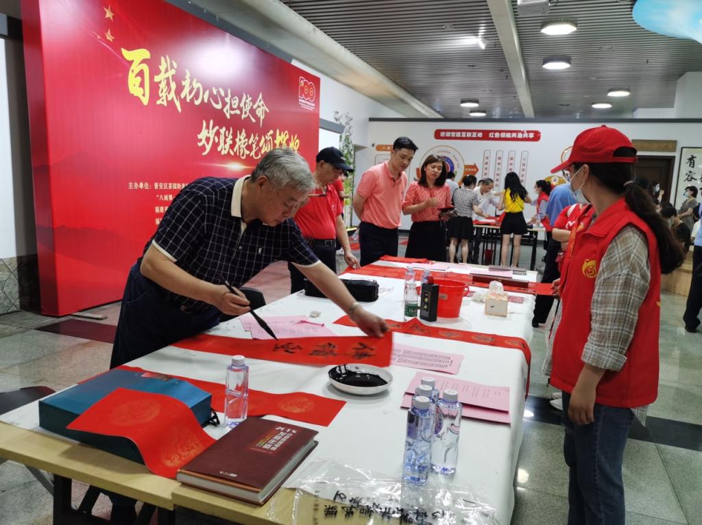 主題活動現場,來自省市楹聯學會的書法家們揮毫潑墨,以慶祝中國共產黨成立100周年為創作主題,以書春送祝福的形式,免費贈送給各黨建聯盟單位和現場過往的旅客,以聯言志、以墨寄情,與廣大市民一起回顧我們黨偉大而光輝的歷程,以實際行動為中國共產黨建黨一百周年獻禮。