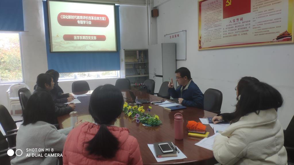 為深入學習貫徹中共中央、國務院印發的《深化新時代教育評價改革總體方案》的文件精神,12月31日下午,醫學系第四黨支部書記鄧元榮同志組織支部全體黨員進行專題學習討論。