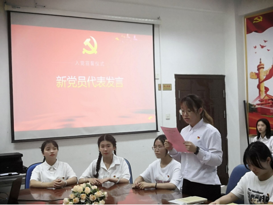 宣誓結束后,新黨員代表林詩穎同學結合自身實際情況作了發言。她表示作為黨組織的新人,要深入學習貫徹落實習近平總書記在慶祝中國共產黨成立100周年大會上的重要講話精神,以實際行動踐行入黨誓詞,以實現中華民族偉大復興為己任,不負時