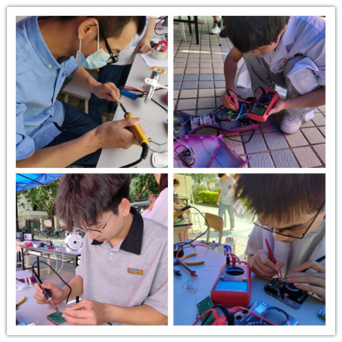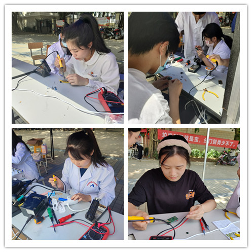 活動現(xiàn)場,工作人員積極向同學們科普科技小知識,帶領同學們參觀各個活動區(qū)域并介紹各區(qū)域的分工;利用平時學到的專業(yè)知識,現(xiàn)場對同學們送來的故障小電器進行檢測和維修。他們專注的模樣也吸引了過往師生駐足旁觀,有的甚至申請親自動手嘗試感受焊接的魅力。參加維修活動的同學互相配合,互相學習探討,每修好一件電器,大家都非常開心,在求知與實踐中他們收獲了滿滿的快樂與成就感。