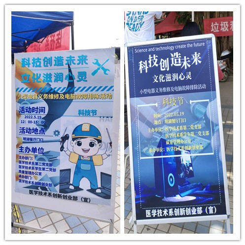 科技創(chuàng)造未來,技能造福人類。在如今科技高速發(fā)展的時代背景下,為了響應學校提高大學生科學素質的號召,實現(xiàn)推進高??茖W技術發(fā)展的目的,秉承“業(yè)精德誠”的校訓,醫(yī)學技術系第二黨支部、質量管理辦公室,醫(yī)學技術系學生第一黨支部及學生第二黨支部聯(lián)合系團總支創(chuàng)新創(chuàng)業(yè)部于2022年5月19日在校明湖廣場舉辦以“科技創(chuàng)造未來,文化滋潤心靈”為主題的第二屆科技節(jié)之小型電器義務維修及電腦故障排除活動。