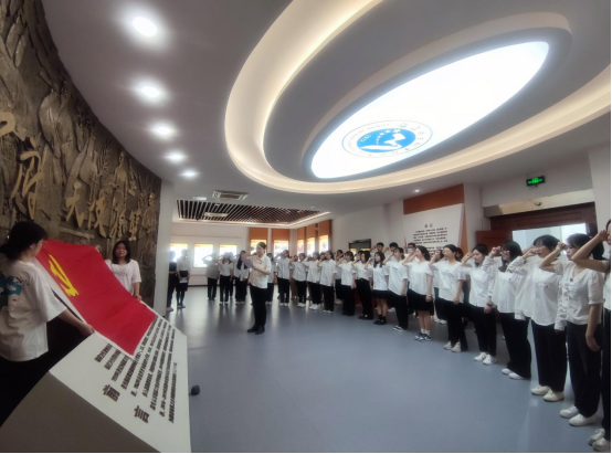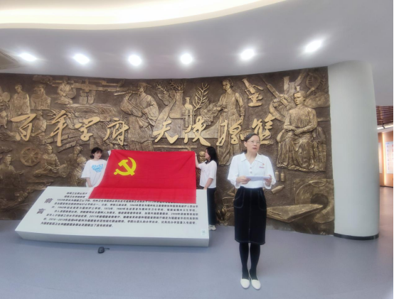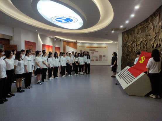在學生第二黨支部書記蔣程序同志帶領下,敖昌群等預備黨員面向黨旗,舉起右手,莊嚴宣誓,用鏗鏘有力的聲音許下新時代共產黨人鄭重的承諾。擲地有聲的誓言響徹校史館,印證百年閩衛院人的使命當擔。