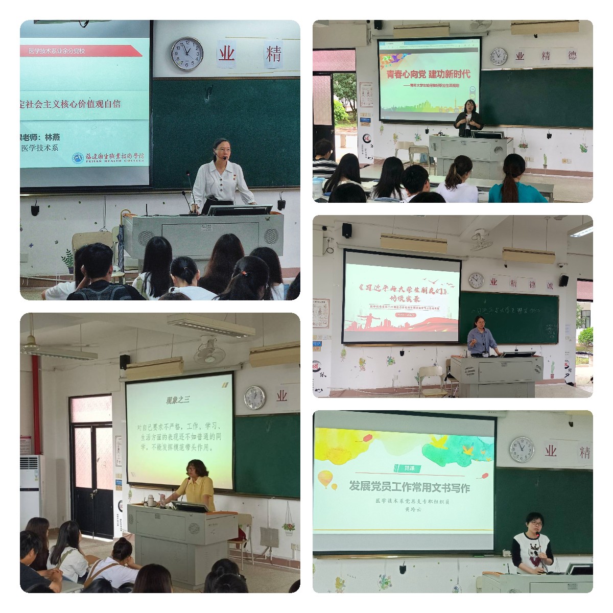 醫學技術系黨總支副書記林燕圍繞社會主義核心價值觀為學員們上黨課,她強調新時代大學生要重視社會主義核心價值觀的培育,爭做社會主義核心價值觀模范踐行者;黨總支委員陳念文圍繞“怎樣成為一名合格的大學生黨員”主題,站在學生視角,詳細剖析新時代學生黨員的要求;學生第一黨支部書記龍梅梅以《青春心向黨,建功新時代》為題,結合職業發展規劃和就業指導,引導學員們腳踏實地、以行動入黨;學生第二黨支部書記蔣程序領學《習近平與大學生朋友們》,引導學員們深入感受到人民領袖對青年一代的親切關懷和殷切期望,堅定做一名新時代有志有為青年的信念;黨總支專職組織員黃玲云開展發展黨員工作常用文書寫作指導,引導學員們及時向黨組織匯報思想動態,積極接受黨組織和培養人的指導意見。