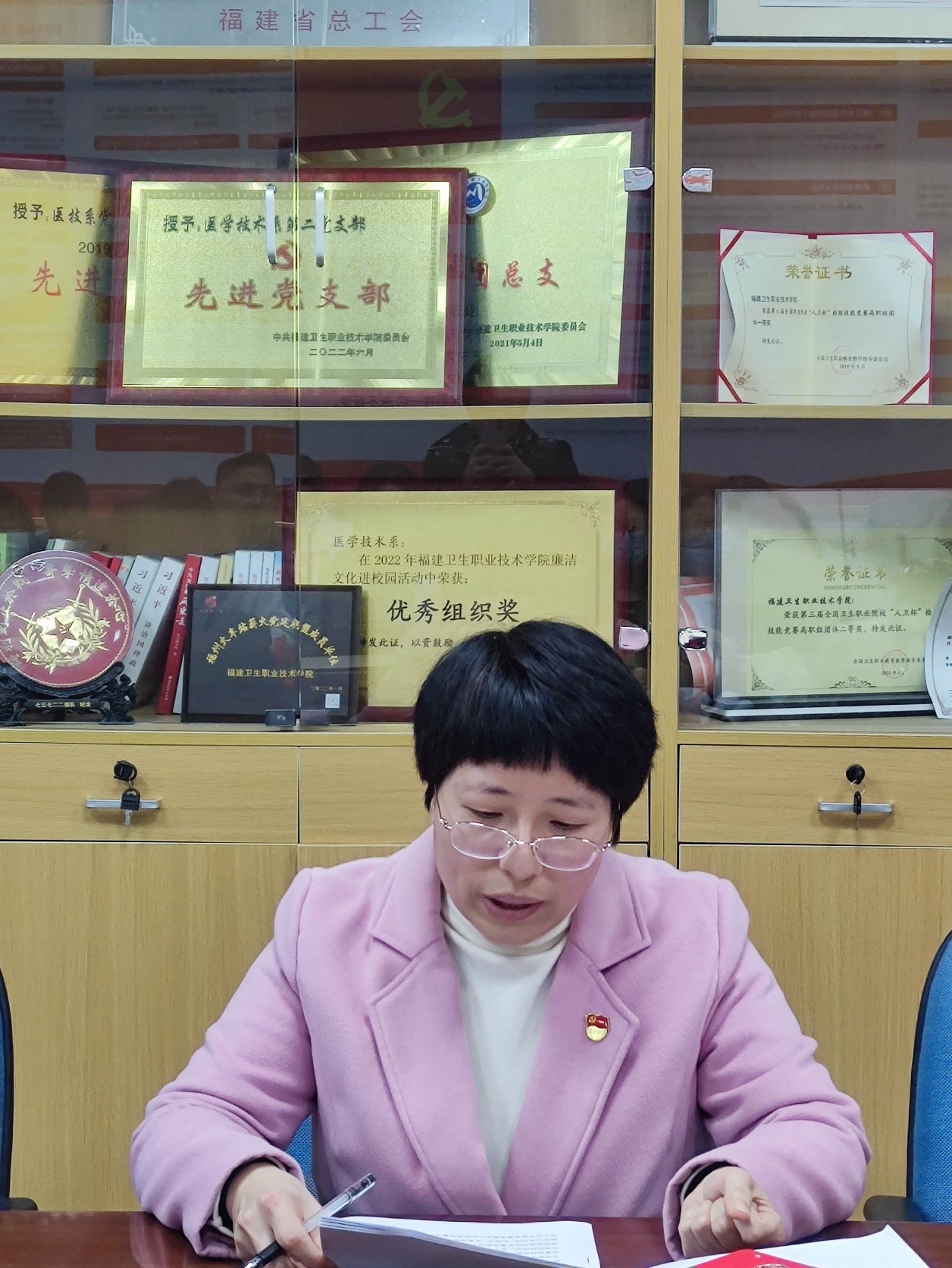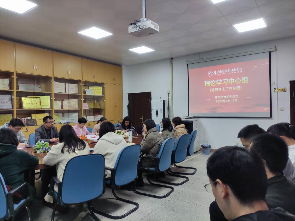 2月23日,醫學技術系黨總支書記柯瓊鶯主持召開理論學習中心組(擴大)會議,開展意識形態工作專題學習,主要學習黨的二十大報告中有關意識形態工作有關論述,以及《習近平關于社會主義精神文明建設論述摘編》、《深入學習習近平關于教育的重要論述》、《中國共產黨宣傳工作簡史》(上卷)等內容。
