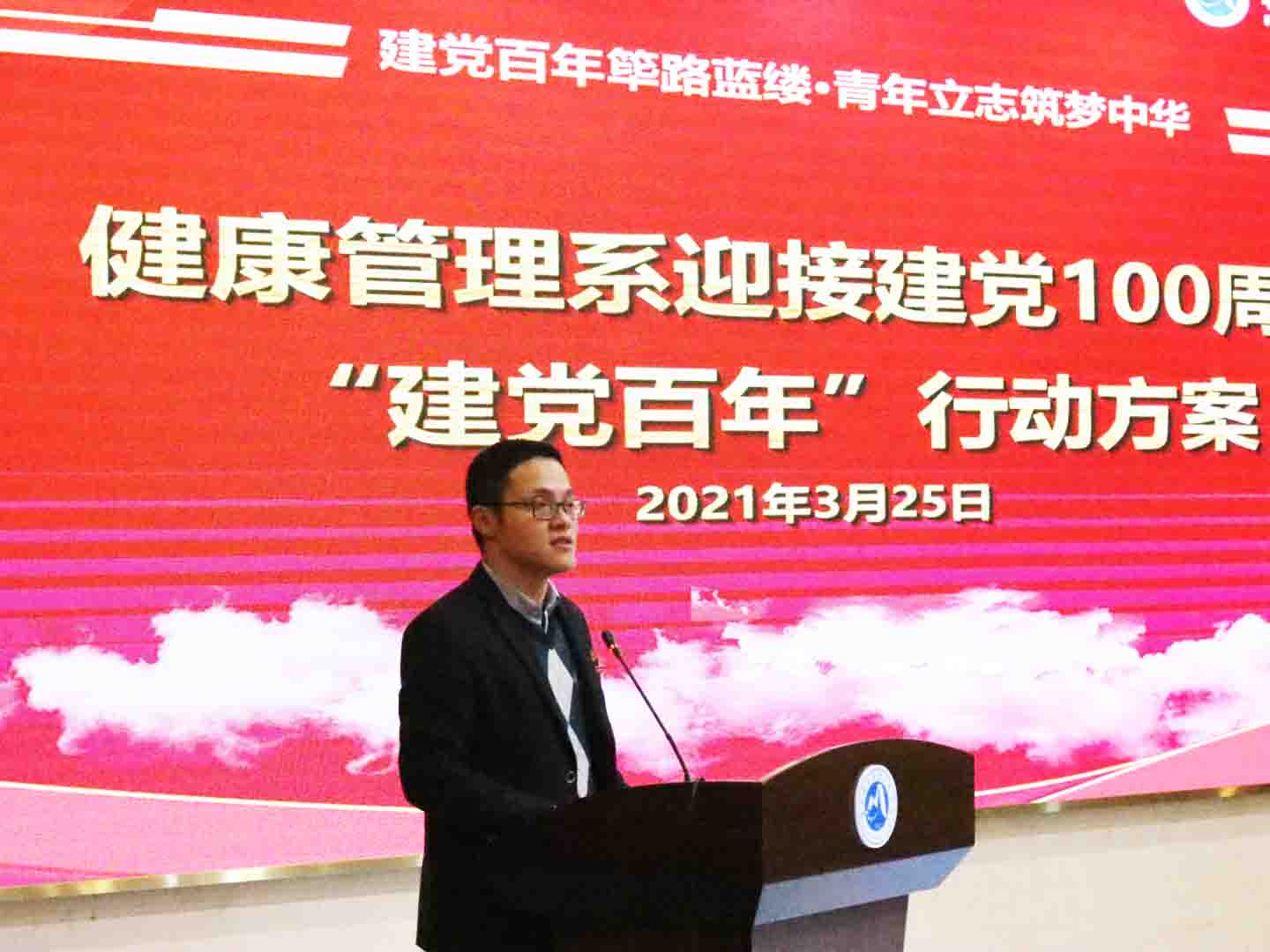 學黨史,迎接中國共產黨成立100周年。黨總支書記黃曦介紹了健康管理系迎接建黨100周年“建黨百年”行動方案。行動方案確定了全覆蓋開展黨史學習、開展“我為群眾辦實事”實踐活動、開展慶祝建黨 100 周年文化活動、推進新時代基層黨的組織建設四個方面16條措施,推動全系師生學黨史、悟思想、辦實事、開新局。師生們還共同觀看短片《共產主義信仰》,追憶百年黨史,領悟初心使命,激揚青春夢想,勇擔時代重任。
