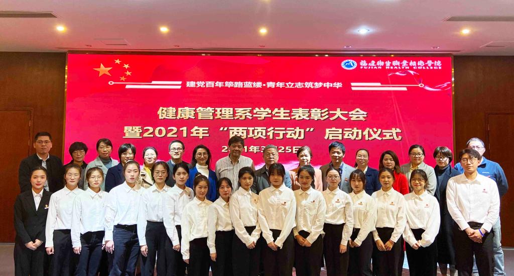 2021年3月25日下午,健康管理系以“建黨百年篳路藍縷,青年立志筑夢中華”為主題,舉行學生表彰大會暨2021年“兩項行動”啟動儀式,大會表彰了2019~2020學年先進集體和先進個人,啟動了健康管理系2021年迎接建黨100周年“建黨百年”行動和“學生管理質量提升”行動。校領導陳貞健副院長出席活動并講話,學工部副部長張麗萍、系關工委鄭向紅主任、王屏副主任、伍麗萍老師,系黨政班子成員及全體教職工和學生代表400多人參加活動。