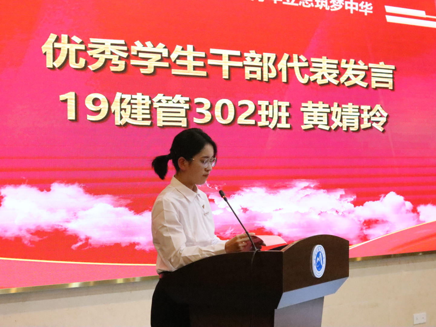 樹典型,激勵廣大學子勤奮學習筑夢中華。系主任莊海林宣讀了表彰決定,參會領導和各專業帶頭人、教研室主任為獲獎學生代表頒獎。黃婧玲、馬黎娜、陳詩婷等3名同學作為獲獎學生代表發言,匯報個人事跡,交流學習生活。
