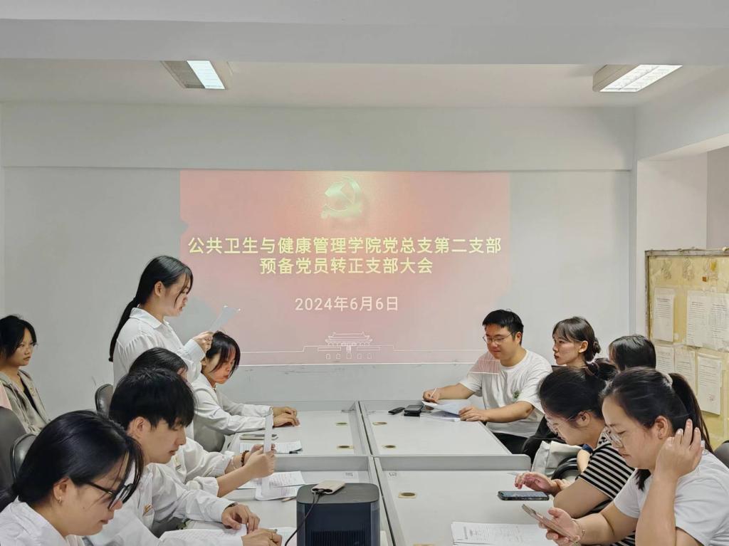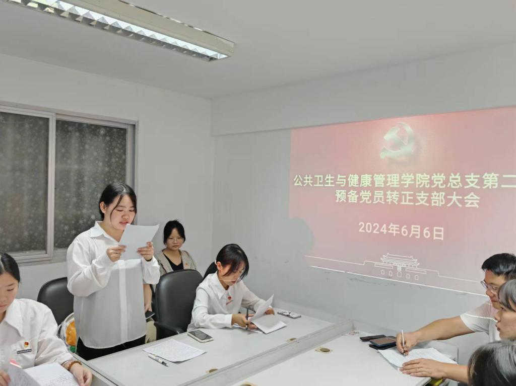 6月6日,公共衛(wèi)生與健康管理學(xué)院黨總支第二支部在學(xué)院會(huì)議室隆重召開(kāi)了預(yù)備黨員轉(zhuǎn)正大會(huì),會(huì)議主要討論并審議了張藝銘7名預(yù)備黨員轉(zhuǎn)為正式黨員的申請(qǐng)。會(huì)議由黨支部書記張凱捷同志主持,支部全體黨員參加了此次大會(huì)。