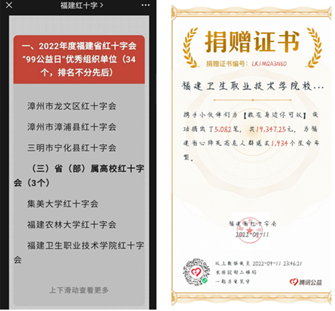 2022年“99公益日”期間,我校積極響應號召,統一部署、上下聯動,開展網絡募捐活動,動員捐款5000余人次,募捐金額19000余元,在2022年度福建省紅十字會“99公益日”優秀組織單位省(部)屬高校紅十字會中位居前三,獲“2022年度福建省紅十字會‘99公益日’優秀組織單位”。