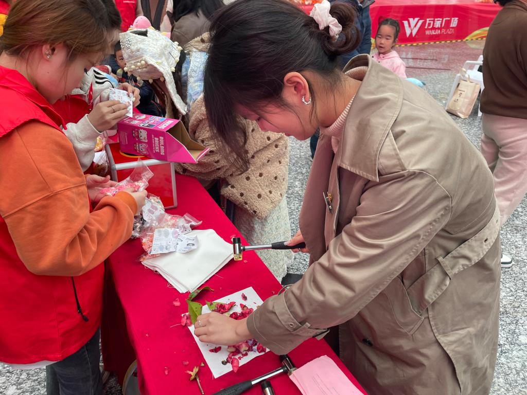 舞臺(tái)下的游戲互動(dòng)區(qū)與健康服務(wù)區(qū)也同樣精彩。志愿者們將結(jié)核防治核心知識(shí)巧妙融入游戲之中,設(shè)計(jì)了“直擊結(jié)核要害”投壺游戲、以結(jié)核防治為主題的“結(jié)核知識(shí)對(duì)對(duì)碰”繪畫(huà)活動(dòng)、中醫(yī)(植物)拓印以及創(chuàng)意扭扭棒等互動(dòng)游戲。